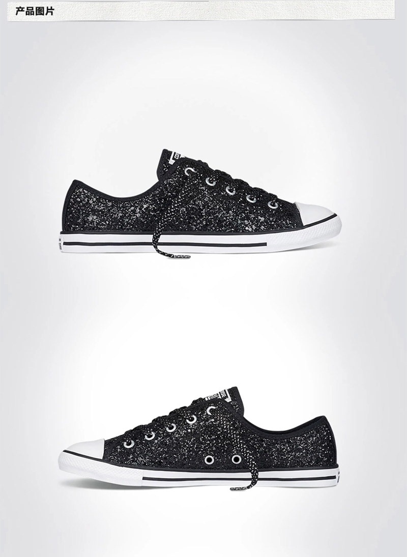 匡威544956-專為女性設計的Dainty鞋型,整體看上去較優雅和小巧秀氣。鞋面布滿亮片,低調中彰顯一絲華麗。精致包邊細節凸顯高級質感。彈性橡膠薄底,行走輕盈自在