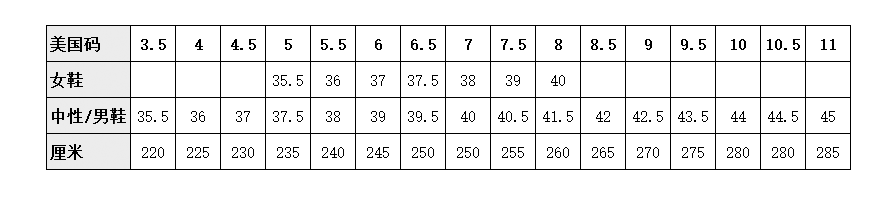 尺碼對照